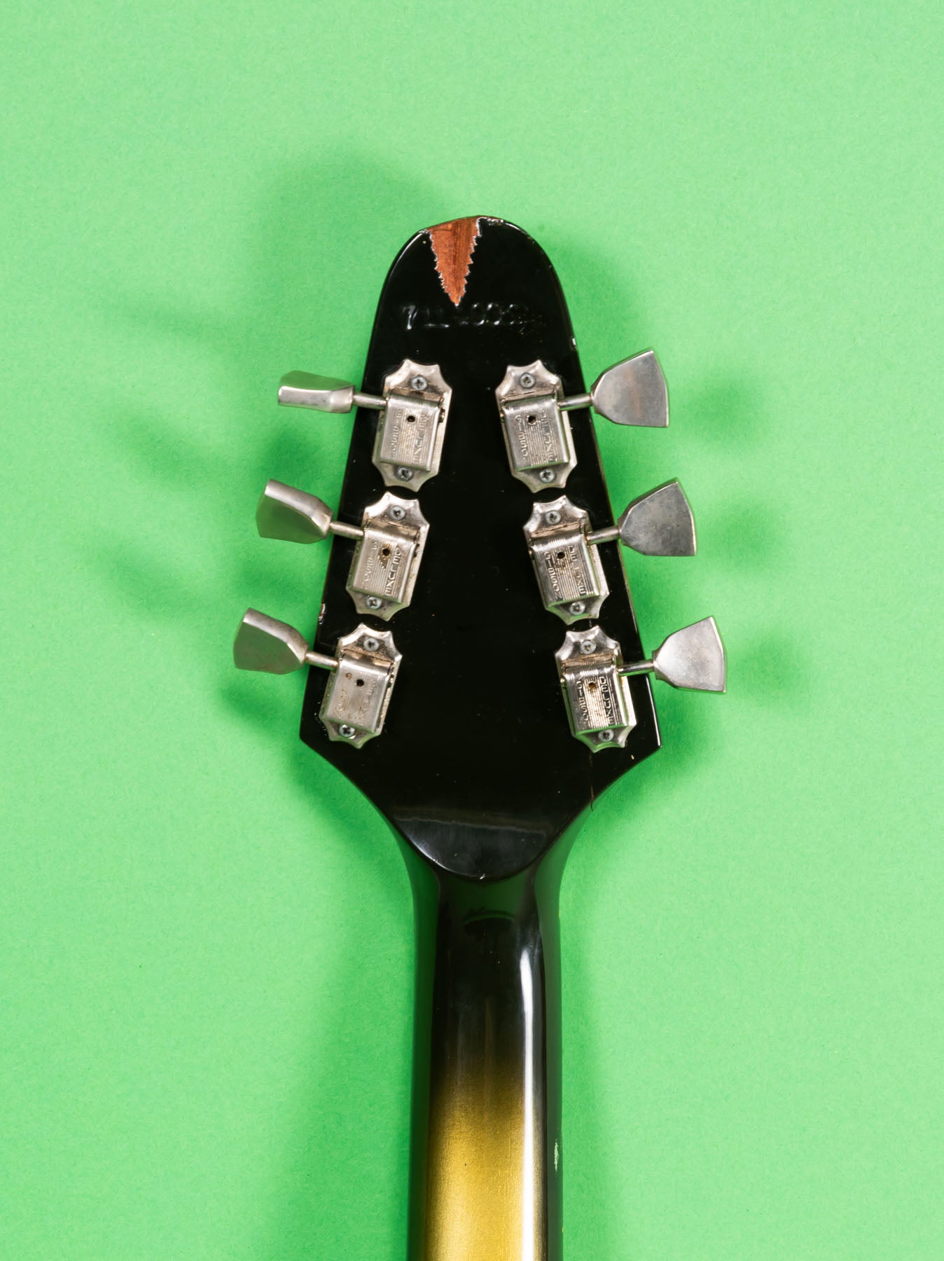 This one is kind of rare, from 1979. I have had a few Silverburst V's but most are later. This one still has the 1970s headstock shape. When this guitar came in, it did not have the original tuners or pickups. Now the guitar has original pickups and tuners. The holes for the pickups only on the pick guard have slight modification, that can be seen in the pictures. Nothing was done to the body. The finish is all original and not very faded.